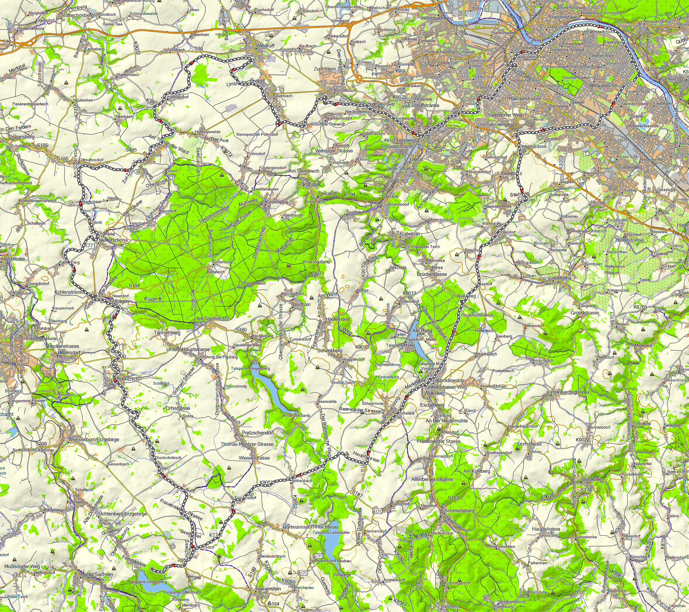 Der Streckenverlauf kann meiner Karte entnommen werden. Ab Burkersdorf verläuft die Strecke auf der Bahntrasse, bis dahin habe ich mir die Strecke von Komoot anzeigen lassen. Nicht so toll ist, dass mich Komoot ein klein wenig über die viel befahrene B 170 schickt. Das ist sicherlich besser möglich.