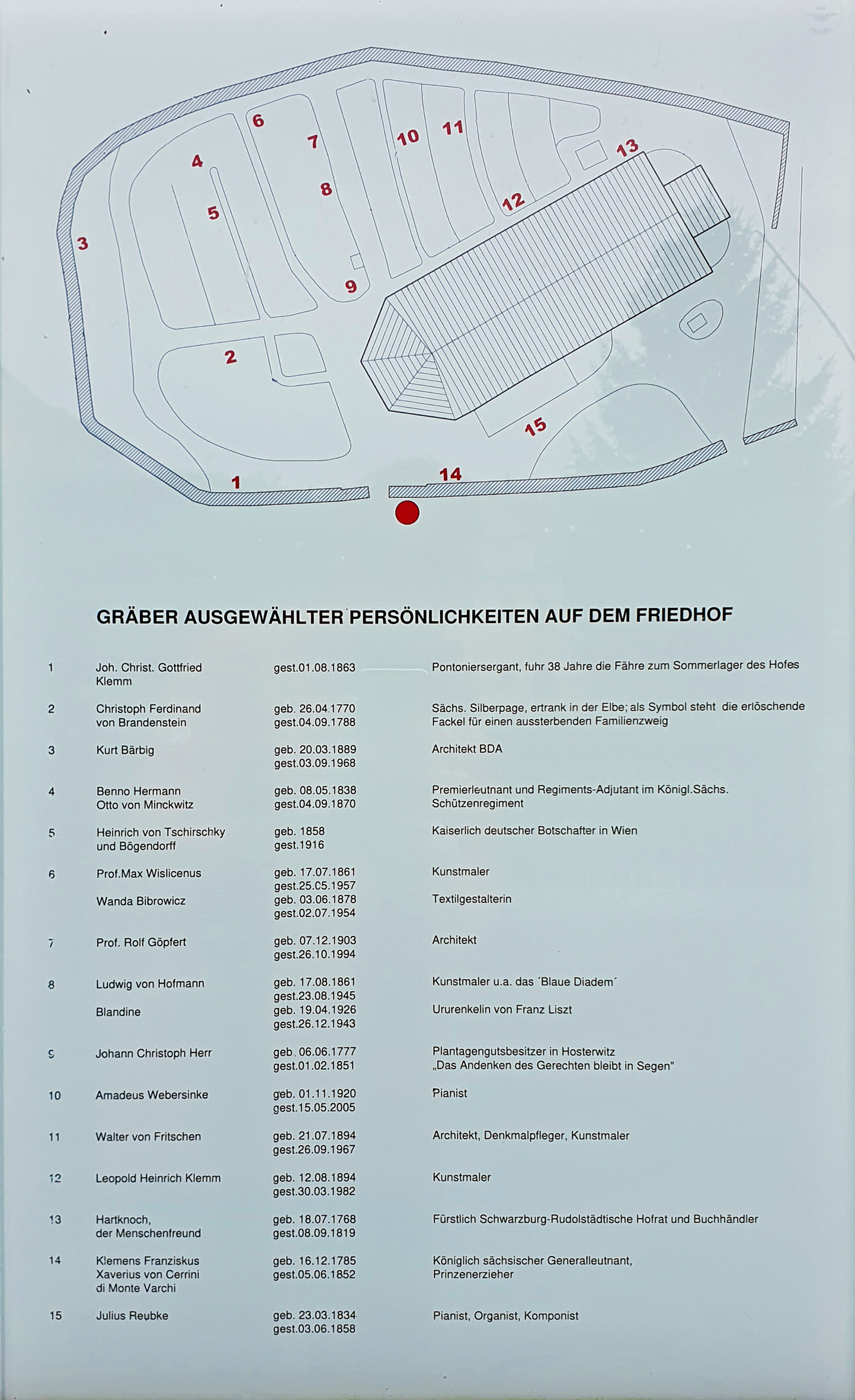 Zum 13. Februar bin ich Richtung Hosterwitzer Friedhof gewandert. Ist nur eine kleine Wanderung, aber sie ist sehr schön und vor allem ruhig um diese Jahreszeit. Entdeckt habe ich viel. Das Grab von Amadeus Webersinke auf dem Hosterwitzer Friedhof hatte ich an einer ganz anderen Stelle vermutet. Aber es ist noch da. Ich hatte den Standort anders in Erinnerung.