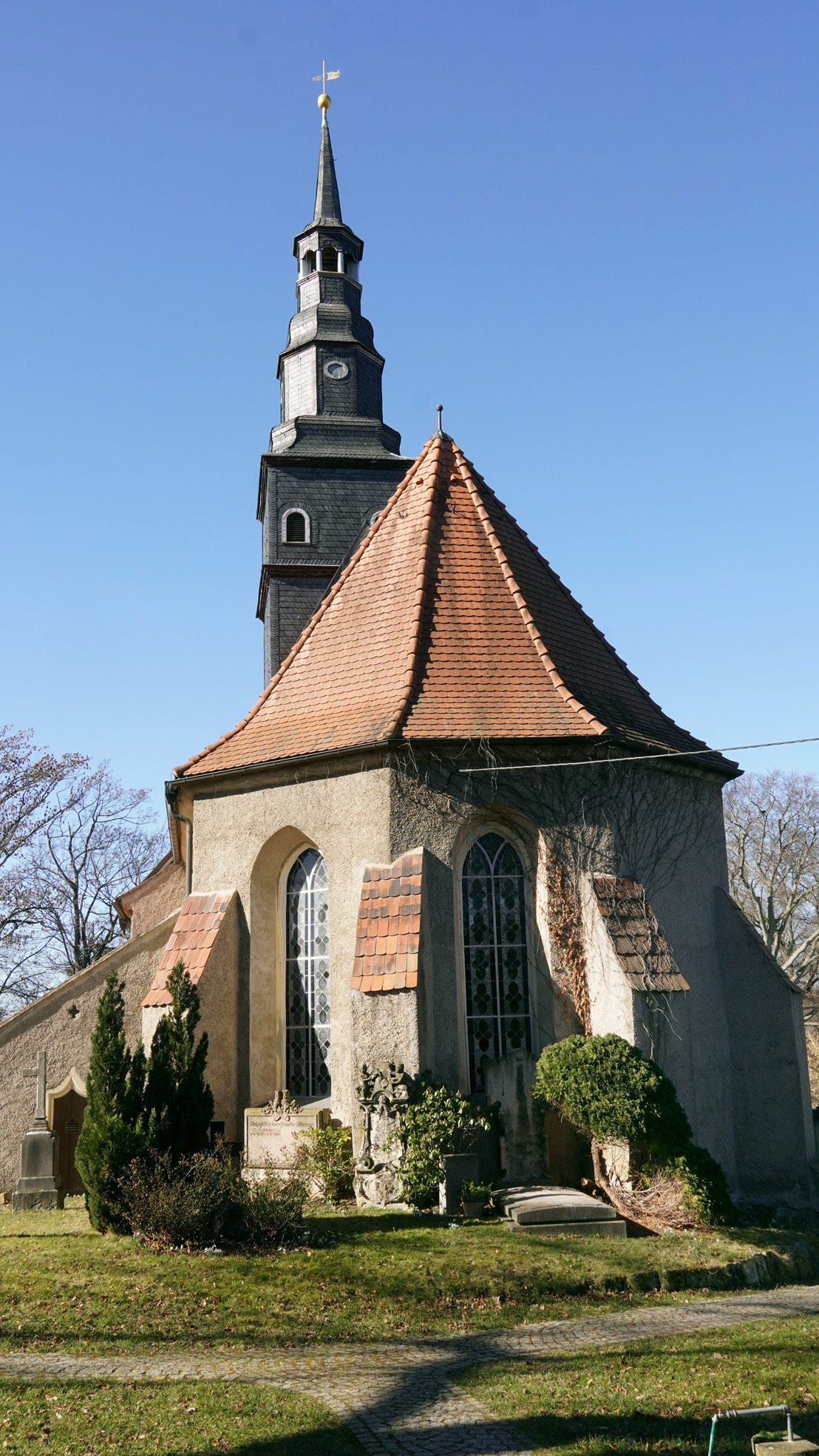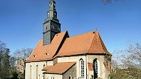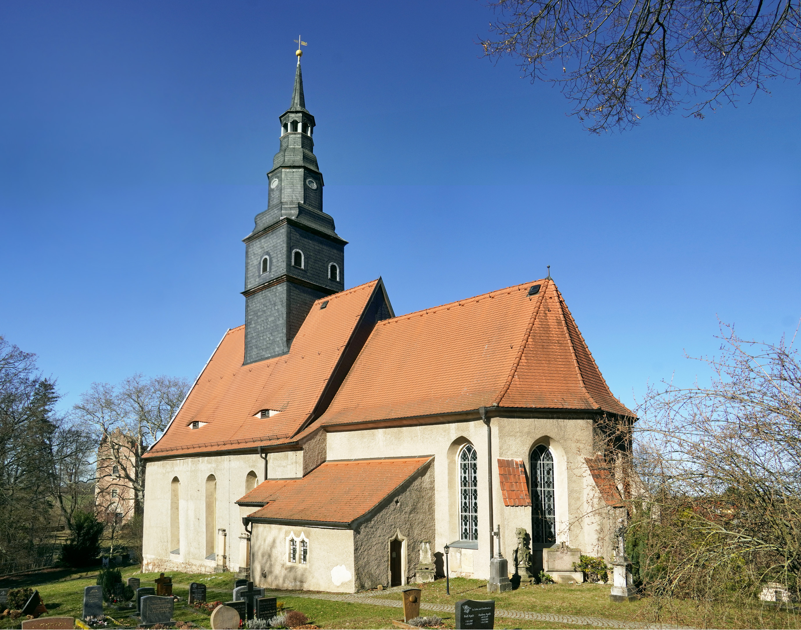 Knapp 100 Meter östlich des Schlosses steht die Dorfkirche. Ihre Grundmauern entstammen dem 13. Jahrhundert. Der mit einem Zellen- und Netzgewölbe ausgestattete Chorraum entstand um 1515 vermutlich unter Mitwirkung eines Schülers von Arnold von Westfalen. Der Dachreiter bekrönt den Kirchturm seit 1625/26. Bis heute in Betrieb ist die mechanische Turmuhr von 1787. Umbauten im neogotischen Stil erfolgten 1849 sowie 1865 bis 1867.